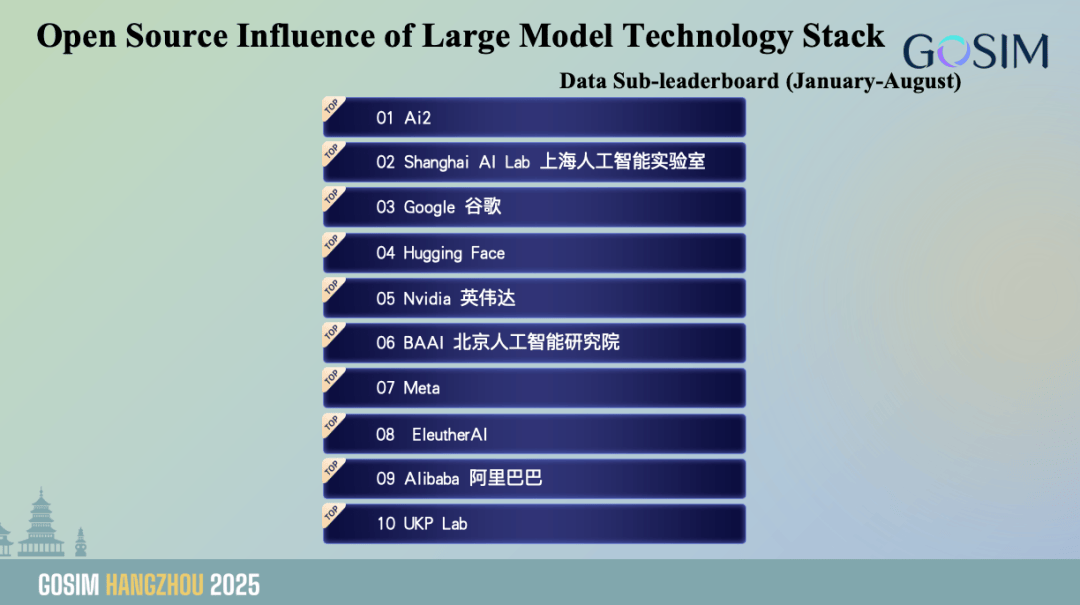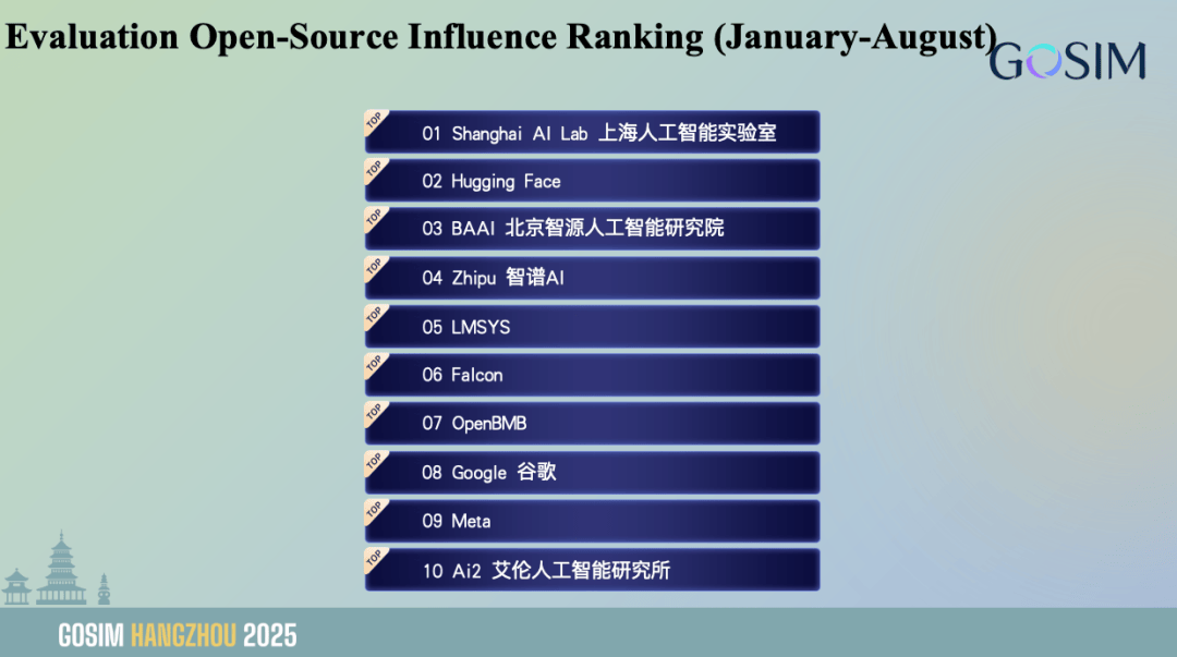 同时我们也很是但愿将中国的开源手艺和全球的开源更好地毗连起来,Ai2、上海人工智能尝试室和谷歌位居前列;此中上海人工智能尝试室正在开源评测数据集和东西数量上处于领先地位,全球开源生态呈现出持续扩张取区域款式多样化演变趋向。跃升至 2025 年的 94 位,我们能够看到正在这个榜单上,