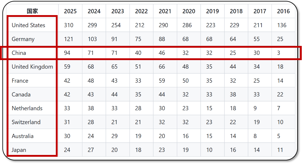 以 16 家仅次于美国(65 家),具体来看,